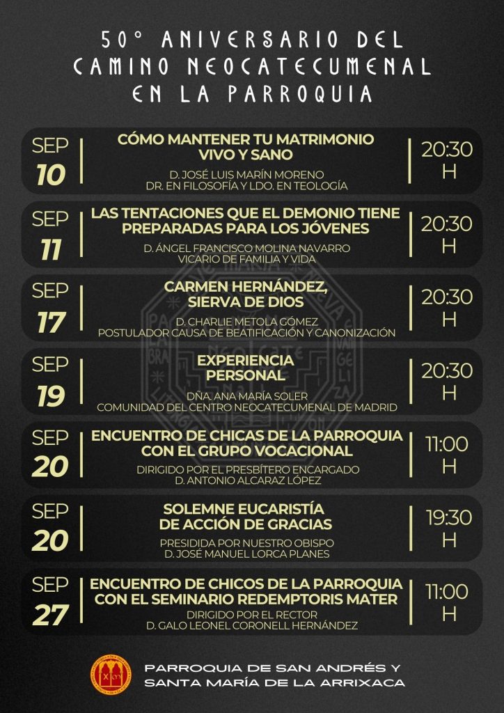 Durante el mes de septiembre de ese año, se realizaron distintos encuentros y catequesis, teniendo como evento central una Eucaristía Solemne presidida por el Obispo, Don José Manuel Lorca Planes, a la que acudieron todos los hermanos, los presbíteros que han salido o pasado por San Andrés, catequistas, además de las comunidades de la Parroquia de Ntra. Sra. de los Ángeles (Sangonera la Verde, Murcia) y todos los hermanos que, al casarse, caminan ahora en otras Parroquias.
